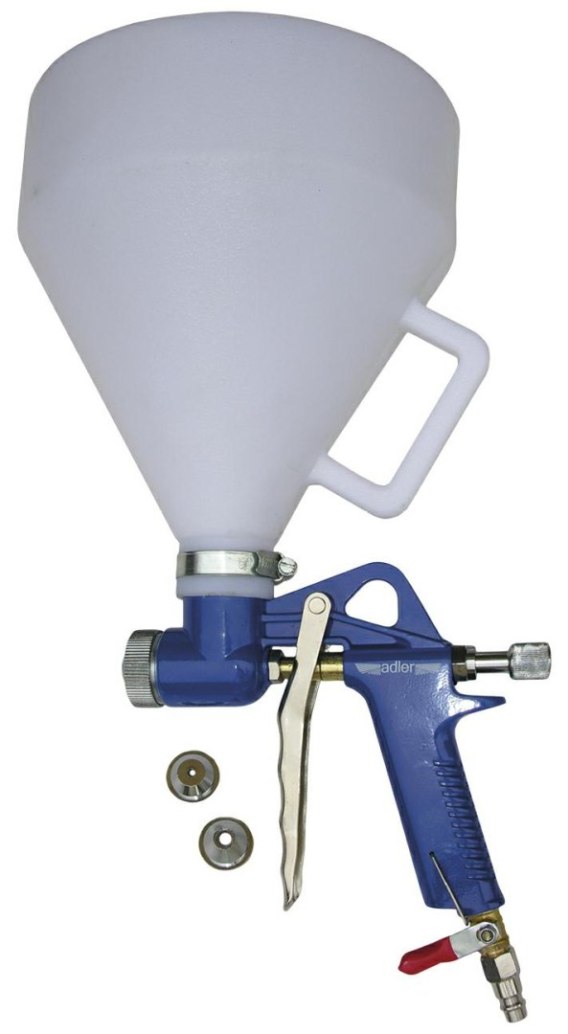 Pistolety do tynków i mas gęstych typu Hopper służą do malowania rzadkimi tynkami natryskowymi, farbami strukturalnymi, barnakami itp. Przeznaczone do malowania elewacji i ścian materiałami, które będą za gęste lub zbyt ziarniste dla pistoletów lakierniczych. Dzięki wymiennym dyszom można dobrać odpowiednią średnicę do stosowanego materiału. Model AD-8030P wyposażony jest w zbiornik o pojemności 5 litrów wykonany z tworzywa sztucznego. W zestawie znajdują się trzy dysze o średnicach 4, 6 oraz 8 mm. Na wlocie powietrza dodatkowo zawór kulowy ułatwiający pracę pistoletem. Dane techniczne: Nazwa: AD-8030P Kod towaru: MA8030P Typ zbiornika: górny (grawitacyjny) Pojemność zbiornika: 5 l Średnica dysz w zestawie: 4, 6, 8 mm Zużycie powietrza: 340 - 425 l/min Ciśnienie pracy 4 - 8 bar Waga: 1,03 kg