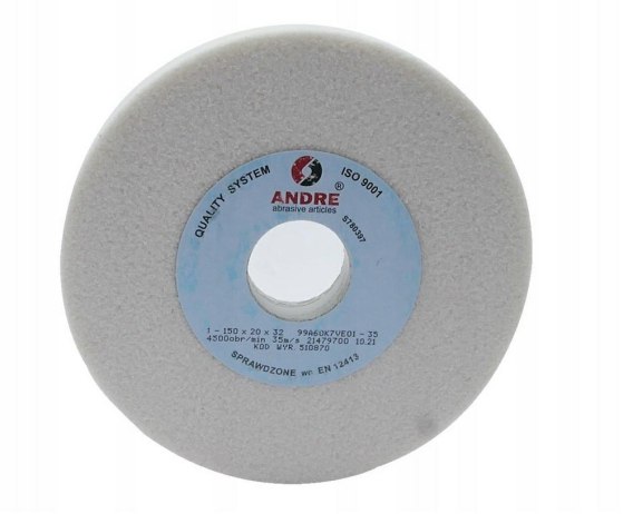 Ściernica płaska (Typ 1) ze spoiwem ceramicznym, z ziarnem 99A - Elektrokorund szlachetny (biały). Charakteryzuje się dużą twardością i kruchością. ZASTOSOWANIE - do precyzyjnego szlifowania - do ostrzenia narzędzi skrawających. PARAMETRY - ziarno: 99A - Elektrokorund szlachetny (biały) - gradacja: 60 - średnica: 150 mm - szerokość: 20 mm - średnica otworu: 32 mm - maksymalna prędkość: 35 m/s - producent: ANDRE - kod: 510870