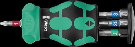 Bardzo mała rękojeść z bardzo krótkim uchwytem do bitów idealnie nadaje się do trudno dostępnych miejsc. Drobnozębna grzechotka zintegrowana z rękojeścią zapewnia szybką pracę. Intuicyjne przełączanie: przełączenie w prawo powoduje zmianę kierunku pracy na dokręcanie w prawo, przełączenie w lewo powoduje zmianę kierunku pracy na dokręcanie w lewo. Mechanizm zapadkowy można zablokować w pozycji 0 dla zapewnienia precyzyjnej pracy. Mechanizm zapadkowy można zablokować w pozycji 0 dla zapewnienia precyzyjnej pracy. Zawiera 7 bitów ze stali nierdzewnej, z których 6 znajduje się w magazynku w rękojeści, a 1 w uchwycie do bitów. System wyszukiwania narzędzi Take it easy: z oznaczeniem kolorystycznym profilu i rozmiaru ułatwiającym znalezienie odpowiedniego bitu. Silny magnes stały w uchwycie na bity zapewnia ich niezawodne mocowanie. 2-komponentowa rękojeść Kraftform z praktyczną kombinacją strefy twardej i miękkiej umożliwia pewny chwyt i precyzyjną pracę.
