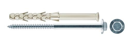 Dybel ramowy , koszulka nylonowa z długą strefą rozporową , wkręt z łbem sześciokątnym z zespoloną podkładką , ocynkowany na biało .