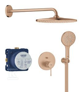 Podtynkowy zestaw prysznicowy Essence z deszczownicą Rainshower Mono 310, warm sunset, elementy składowe: jednouchwytowa bateria podtynkowa do obsługi dwóch wyjść wody, Rapido SmartBox uniwersalny element podtynkowy, deszczownica z ramieniem 422 mm, słuchawka prysznicowa 3 strumienie, kolanko prysznicowe 1/2" z uchwytem, wąż prysznicowy 1500 mm o numerze katalogowym 25287DL0 w kategorii Zestawy prysznicowe>Deszczownice, głowice górne, zestawy z bateriami. Produkt wyprodukowany przez markę GROHE, seria ESSENCE.