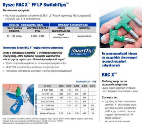 Dysze, dysza RAC X FF LP 512 Końcówka, dysza niskociśnieniowa do gładkich wykończeń. Z opatentowaną technologią SmartTip końcówek Graco RAC X, których wyjątkowa geometria wewnętrzna pozwala zapewnić najlepsze wykończenie w branży nawet podczas natrysku bezpowietrznego przy niskim ciśnieniu! Natryskiwanie przy możliwym obniżeniu ciśnienia do 50% Bez nadmiernego rozpylania Łatwiejsze nanoszenie wzorów nachodzących na siebie Skrócony czas przygotowań i sprzątania Nawet 2 x dłuższa żywotność
