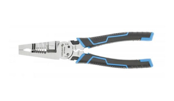 Uniwersalne narzędzie 9 w 1, łączące w sobie wiele funkcji użytkowych, pozwalających na wygodne i szybkie wykonywanie zróżnicowanych prac. Oszczędzasz miejsce na kilka narzędzi i obniżasz wagę torby narzędziowej. Frezowana końcówka szczypiec umożliwia zaciskanie miękkich materiałów, przytrzymywanie obiektów do średnicy 35 mm, ściskanie, zakręcanie, wyciąganie, chwytanie. Uchwyt do okrągłych elementów, dzięki asymetrycznym nacięciom, pozwala mocniej przytrzymać obiekt lub nakrętkę. Ściągacz izolacji przewodów elektrycznych dzięki precyzyjnie wyciętym ostrzom, nie uszkadza rdzenia. Twarda gilotyna pozwala ciąć drut stalowy. Obcinarka pozwala skracać nity o rozmiarach 6-32 oraz 8-32. Zaciskarka zapewnia trwałą obróbkę tulejowych końcówek przewodów elektrycznych 0,75-1,5 oraz 1,5-2,5 mm2. Wysokiej jakości, równomiernie utwardzona stal chomowo-wanadowa umożliwia intensywne używanie szczypiec do wymagających dużej siły nacisku, ciężkich prac.