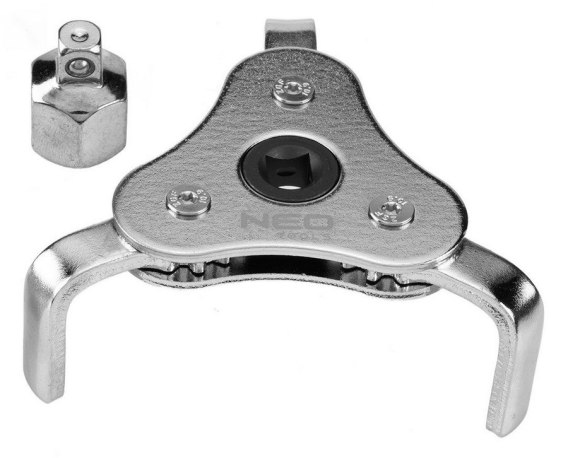 Klucz do filtra oleju NEO do profesjonalnych warsztatów i serwisów samochodowych oraz dla zaawansowanych amatorów. Klucz przeznaczony do sprawnego i prawidłowego montowania zewnętrznych filtrów olejowych z metalową obudową. Klucz ma płaskie szczęki. Konstrukcja trójramienna. Przeznaczony dla filtrów o średnicy od 64 do 100 m. W komplecie redukcja 3/8" oraz 1/2".