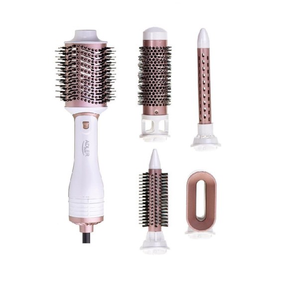 Informacje dodatkowe: 2 stopnie ustawienia temperatury, Zimny nawiew, 5 wymiennych nasadek:, - okrągła szczotka o średnicy 21mm, - okrągła szczotka o średnicy 38mm, - duża szczotka o średnicy 72mm, - lokówka o średnicy 19mm, - suszarka, Szczotki z włosiem nylonowym, Nasadki z powłoką ceramiczną, Zdejmowalny filtr, Ochrona przed przegrzaniem, Przewód obrotowy, Uchwyt do zawieszenia, Kolor przewodu: czarny, Rozmiar urządzenia (bez nasadek): długość 20cm x szerokość 6.4cm, Kolor urządzenia: perłowy biały, różowe złoto