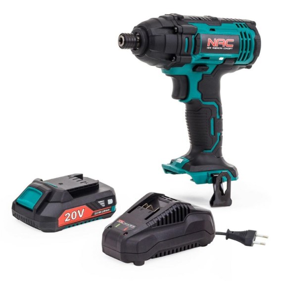 Pokrycie rękojeści/korpusu: antypoślizgowa guma Podświetlenie LED DANE TECHNICZNE: Napięcie akumulatora: 20 V Prędkość obrotowa bez obciążenia: 0 - 2800/min Moment obrotowy: 180 Nm Ilość uderzeń: 0 -3600 ud./min. Średnica uchwytu: 1/4" sześciokątny Klasa ochronności elektrycznej: III W zestawie: zakrętarka udarowa NAC 1 akumulator szybka ładowarka sieciowa