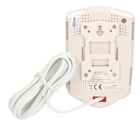 Nowoczesne urządzenie alarmowe do detekcji stężenia gazu ziemnego wewnątrz pomieszczeń. Służy do ciągłego monitoringu obecności i wykrywania gazów palnych wydostających się z nieszczelności. W urządzeniu zastosowano wysokiej jakości czujnik półprzewodnikowy, który pozwala na osiągnięcie wysokiego wskaźnika wykrywalności. Detektor posiada powiadomienie optyczne i dźwiękowe, które uruchamiane jest po przekroczeniu dopuszczalnego stężenia. Poziom alarmowy: 10% LEL, przycisk TEST pozwala sprawdzić poprawność działania czujnika. Dodatkowe wyjście przekaźnikowe umożliwia przekazanie impulsu do innego urządzenia przy przekroczonym stężeniu alarmowym (np. wentylator, syrena alarmowa, dialer telefoniczny), wyprowadzony dodatkowy styk zasilania 12V DC np. do zamknięcia zaworu odcinającego dopływ gazu do instalacji. Średni czas żywotności czujnika wewnętrznego wynosi ok. 5 lat. Rodzaj zasilania sieciowe (230V) Napięcie zasilania 230V~, 50Hz Rodzaje wykrywanych zagrożeń gaz ziemny