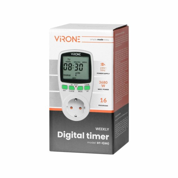 Programator służy do ustawiania momentu włączania i wyłączania urządzeń elektrycznych w określonym przedziale czasowym. Może sterować pracą dowolnego urządzenia elektrycznego jak np. oświetlenie, klimatyzator, ogrzewacz wody, kuchenka elektryczna. Posiada 16 programów czasowych, cztery duże przyciski, a także duży wyświetlacz LCD zapewniający łatwą obsługę oraz czytelny i przejrzysty pomiar. Typ: elektromechaniczny Napięcie zasilania: 230V~, 50Hz Max. obciążenie: 3680 W Prąd: 16 A Typ gniazda: 2P+Z Standard gniazd: Schuko (typ F) Ilość programów: 16 Montaż: Gniazdko sieciowe Stopień ochrony (IP): 20 Wymiary - szerokość: 75 mm Wymiary - wysokość: 147 mm Wymiary - głębokość: 75 mm Wbudowany akumulator: Tak Rodzaj wbudowanego akumulatora: Ni-MH Napięcie wbudowanego akumulatora: 2.4 V Pojemność wbudowanego akumulatora: 40 mAh Zgodność z normą: UN 38.3