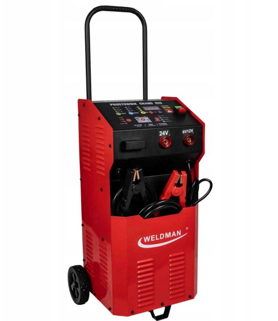 GRAND 820 to zaawansowany prostownik mikroprocesorowy z funkcją rozruchu, przeznaczony do ładowania akumulatorów kwasowo-ołowiowych, takich jak: WET (płynne kwasowe) GEL (żelowe) MF (bezobsługowe) AGM (z matą z włókna szklanego) EFB (do pojazdów z systemem Start-Stop) oraz akumulatorów 12V ? litowo-jonowych (LiFePO4). Dzięki 10-stopniowemu procesowi ładowania, urządzenie zapewnia maksymalną efektywność oraz długowieczność akumulatorów. Napięcie zasilania: 230 V Pobór mocy (ładowanie/rozruch): 2,5 / 17 kW Napięcie prądu: 6/12/24 V Prąd ładowania: 15A / 40A / 65A (BOOST) Prąd rozruchu: 800A dla 12/24 V Pojemność akumulatorów: Do 1000 Ah Wymiary: 30x26x96 cm Waga: 27,5 kg Klasa izolacji: IP20