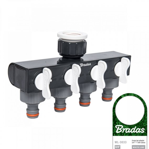 WHITE LINE Rozdzielacz 4-drożny GW 1" - 3/4" z zaworami przywieszka • Posiada gwint wewnętrzny 1" z redukcją na 3/4" • Wykonany z wysokiej jakości materiału • Zakończony czterema nyplami • Wyposażony w cztery niezależne i regulowane zawory do podłączenia czterech linii nawadniających • Zawory pozwalają na wygodną i płynną regulację wody • Umożliwia podłączenie standardowych szybkozłączy • Rodzaj opakowania: przywieszka EAN: 5907544409199