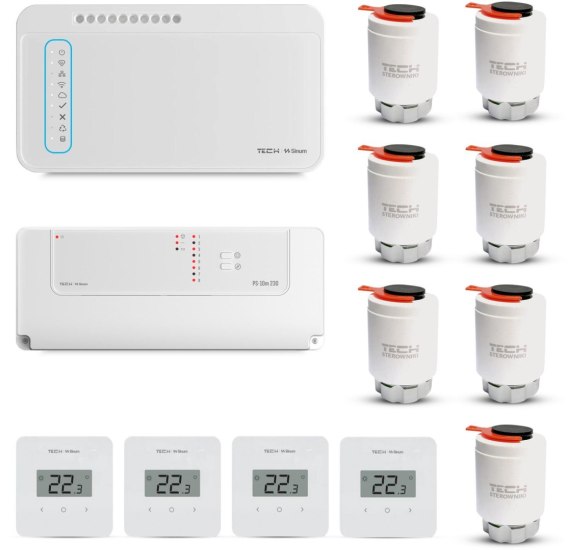 Kompletny zestaw do inteligentnego sterowania ogrzewaniem podłogowym, w domu lub biurze, oparty na rozwiązaniach Polskiej marki Tech Sterowniki.