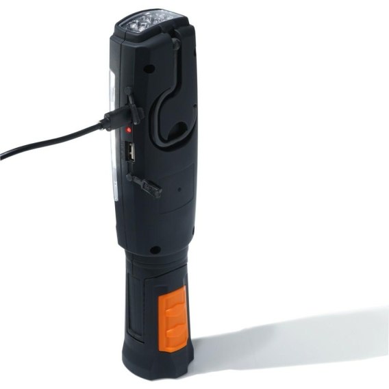 Wysokiej jakości lekka i poręczna lampka, latarka warsztatowa przód - 6 LED bok - 3W COB LED regulowany uchwyt obrotowa główka składany obrotowy wieszak wbudowane 2 magnesy Zasilanie - akumulator litowo-jonowy 2000mAh ładowarka sieciowa i samochodowa