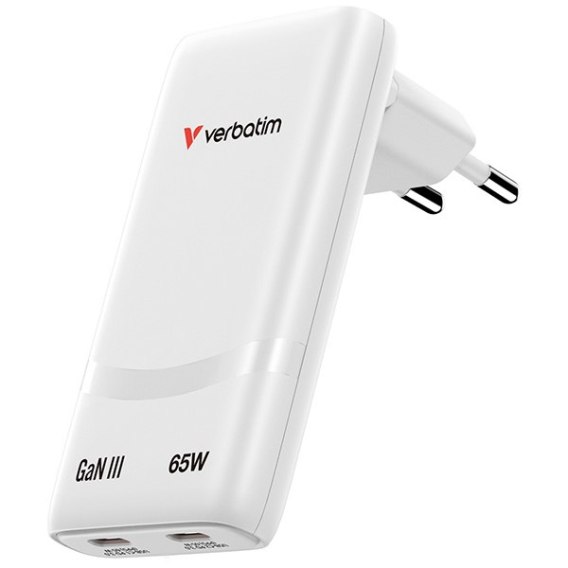 Verbatim Fold ,n, Go, Ładowarka sieciowa GaN 2 USB-C PD 3.0, biała, 65W, wtyczka EU