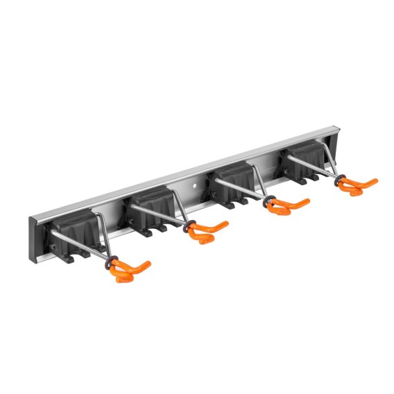 DIY-HG1711 Wieszak na narzędzia 4 uchwyty/ 8 uchwytów pod nypel Cechy produktu: · Ilość wieszaków na szynie: 4 sztuki · Aluminiowa szyna o długości 50 cm · Każdy wieszak posiada dwa dodatkowe uchwyty umożliwiające powieszenie akcesoriów do nawadniania zakończonych nyplem · Podstawa z ABS i hak wykonany z wysokiej jakości stali pokrytej PVC · Przeznaczony na narzędzia o średnicy 15-30mm · Maksymalne obciążenie pojedynczego wieszaka: 2.5 kg · Rodzaj opakowania: color box EAN: 5907544461647
