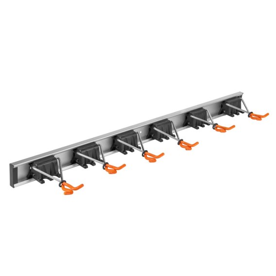 DIY-HG1712 Wieszak na narzędzia 6 uchwytów/12 uchwytów pod nypel Cechy produktu: · Ilość wieszaków na szynie: 6 sztuk · Aluminiowa szyna o długości: 79 cm · Każdy wieszak posiada dwa dodatkowe uchwyty umożliwiające powieszenie akcesoriów do nawadniania zakończonych nyplem · Podstawa z ABS i hak wykonany z wysokiej jakości stali pokrytej PVC · Przeznaczony na narzędzia o średnicy 15-30mm · Maksymalne obciążenie pojedynczego wieszaka: 2,5 kg · Rodzaj opakowania: color box EAN: 5907544461654