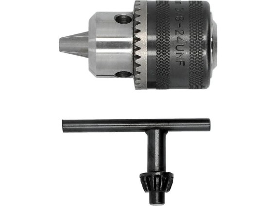 Uchwyt wiertarski z kluczem zapewnia idealną centryczność wiercenia i optymalne przenoszenie siły podczas pracy wiertarką z udarem i bez. Gwarantuje pewne, stabilne trzymanie wierteł, nawet przy dużych obciążeniach. Zastosowanie klucza zwiększa siłę mocowania, orgaiczając ryzyko ślizgania się narzędzia podczas pracy. mocowanie: gwint 3/8" (9,5 mm) 24UNF rozmiar uchwytu narzędziowego: 1,5-10 mm materiał: wysokiej jakości stal węglowa, bardzo trwała i odporna na zużycie mechaniczne doskonała centryczność pracy i stabilne trzymanie wiertła w zestawie klucz wiertarski