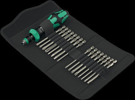 17-częściowy zestaw bitów o długości 89 mm w praktycznym składanym etui. Z 1 uchwytem do bitów 838 RA-R L z funkcją grzechotki. Drobnozębna grzechotka zintegrowana z rękojeścią zapewnia szybką pracę. Innowacyjny mechanizm zapadkowy umożliwia "pokręcanie", gdy śruba stawia niewielki opór. Intuicyjna zmiana kierunku pracy: obrót pierścienia przełączającego w prawo powoduje zmianę kierunku pracy w prawo, obrót pierścienia przełączającego w lewo powoduje zmianę kierunku pracy w lewo. Mechanizm zapadkowy można zablokować w pozycji 0 dla zapewnienia precyzyjnej pracy. Uchwyt szybkowymienny Rapidaptor (odpowiedni do bitów z sześciokątnych 1/4" według DIN ISO 1173-C 6.3 i E 6.3 (ISO 1173)) umożliwia błyskawiczną wymianę bitów bez użycia dodatkowych narzędzi. 16 bitów ciągliwo-twardych (89 mm) do uniwersalnego zastosowania.
