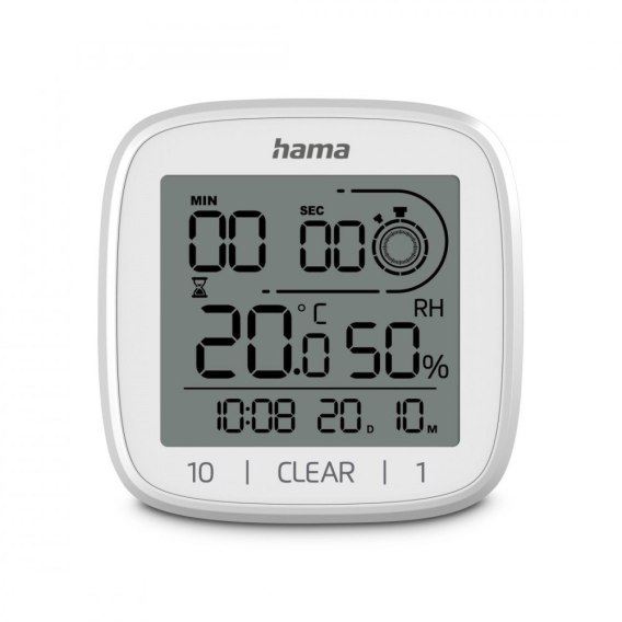 - Zegar łazienkowy z różnymi opcjami pozycjonowania, odliczaniem czasu i wyświetlaniem godziny, daty, temperatury i wilgotności otoczenia.