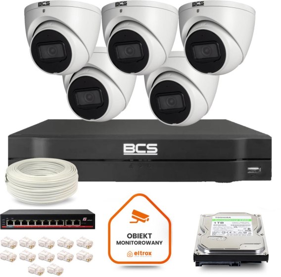 Zestaw monitoringu IP BCS Line 5x Kamera BCS-L-EIP14FSR3-AI1 Rejestrator z dyskiem